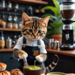 inside a bustling coffee shop , the camera focuses on a whimsical and charming scene. a small cat, dressed in a barista outfit and an apron. its tiny paws whisks matcha intently, surrounded by an assortment of freshly roasted coffee beans, teas and pastries. the coffee shop hums with energy as other cat baristas move swiftly in the background, their blurred movements adding depth to the vibrant setting. They are intently taking orders from customers and others brewing coffee. One cat near this one is pouring latte art slightly off frame. soft warm light glows from overhead lamps,