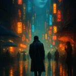 The camera follows the man in the trench coat from behind as he walks slowly forward through the rain-soaked, neon-lit street. Umbrellas sway, pedestrians move naturally in various directions, and rain continuously falls, creating ripples and reflections on the wet pavement. Neon signs flicker and cast colorful glows on surrounding surfaces. The giant holographic face above subtly shifts expression, eyes blinking slowly. The scene is filled with lifelike motion—clothing rustles in the wind, steam rises from grates, and soft ambient lighting pulses through the environment.