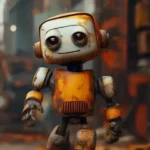 cute rusty robot in the scene walking and looking up. Junkyard.