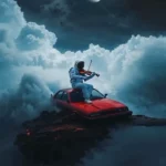 An astronaut playing a violin while sitting on a red car, floating on a rocky platform above the clouds at night. The full moon glows brightly in a starry sky, with thick, dramatic clouds surrounding the scene. The mood is ethereal, serene, and cinematic, with soft lighting and slow atmospheric motion. A surreal dreamscape blending space exploration with classical music in the sky.